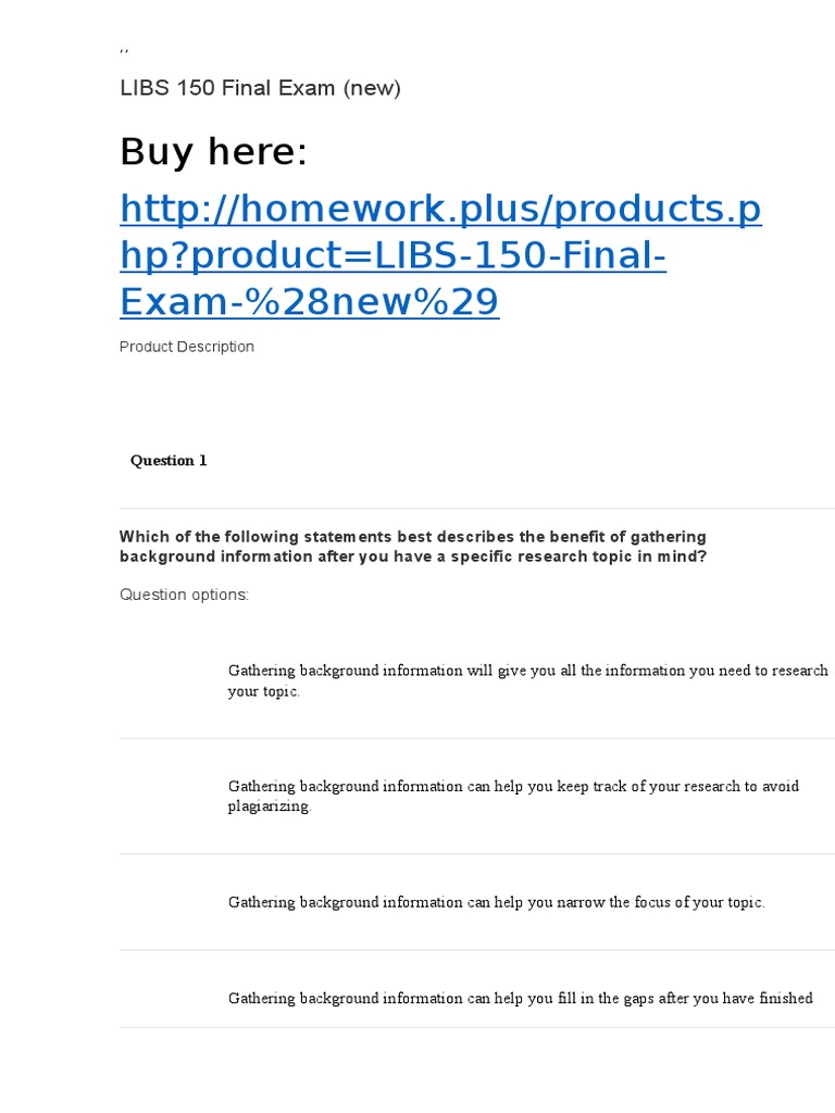 Libs 150 31 quiz answersdocx what students are saying as a current student on this bumpy collegiate pathway i stumbled upon course hero where i can find study resources for nearly all my courses get online help from tutors 247 and even share my old projects papers and lecture notes with other students. Libs 150 final examdocx. Access study documents get answers to your study questions and connect with real tutors for libs 150. Libs 150 final exam answers maintenance guide volvo ec15 mercedes benz w 115 114 repair manual hfss 15 manual stoichiometry guided reading answers 9 1 2006 dodge ram 1500 owners manual world history reading study guide cold war reading guide chapter 18 section 3 chapter 15 reading guide answers morphy richards.