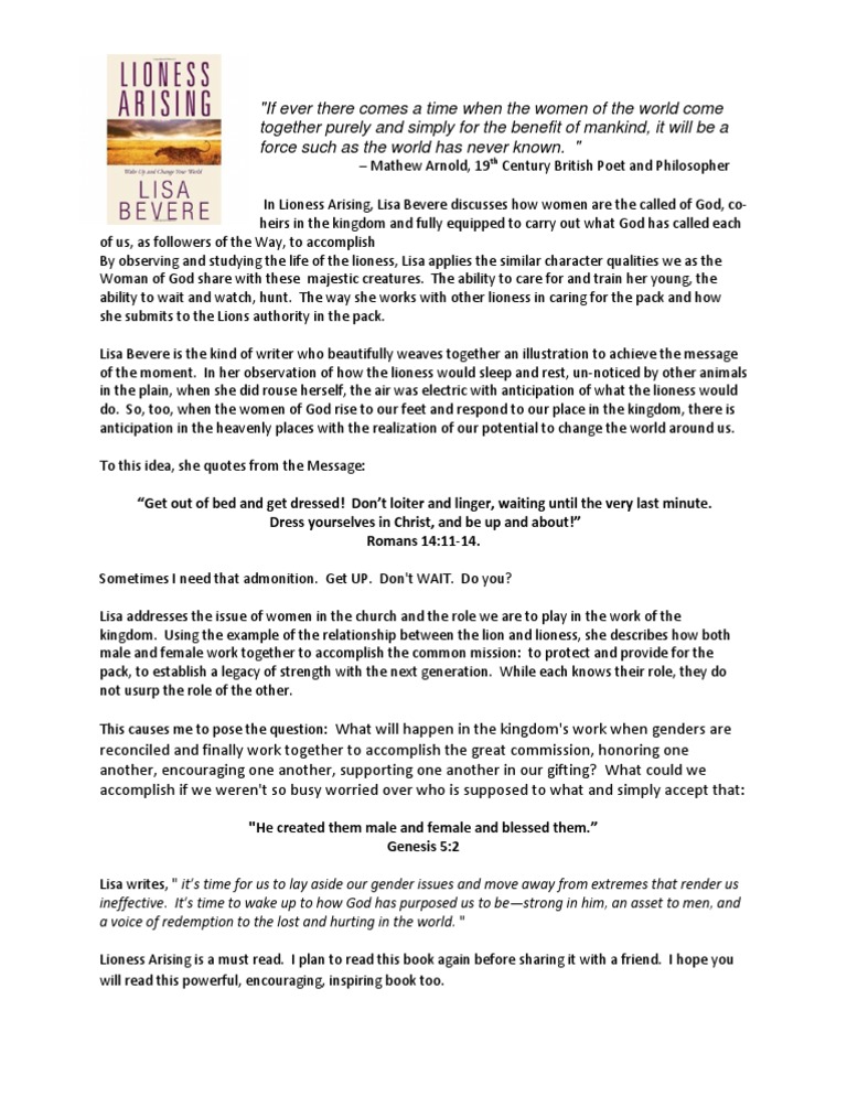 Lioness arising lisa bevere pdf. Lisa beveres authentic passionate and hilarious approach weaves profound biblical truths with practical application. In lioness arising author and speaker lisa bevere offers the life and image of the lioness as a fierce and tender model for women. Her bookswhich include fight like a girl lioness arising and without rivalare in the hands of millions worldwidelisa and her husband john are best selling authors and the founders of messenger international. Revealing the surprising characteristics of this amazing creature lisa challenges women to discover fresh passion prowess and purpose.