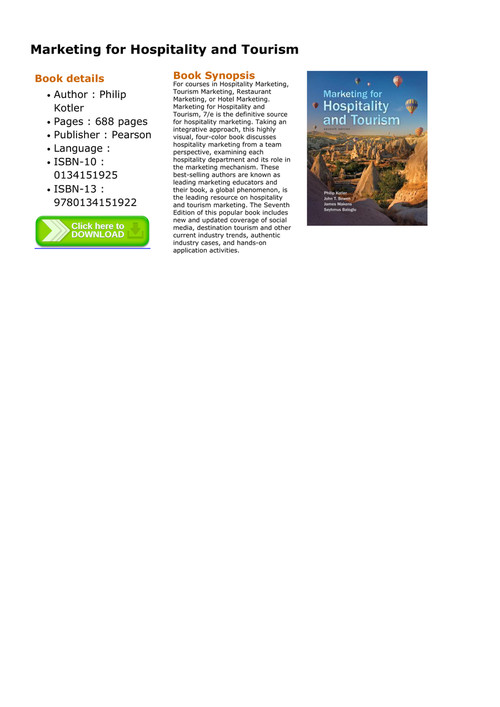 Great textbook hans meyersohn this is the texbook i had in college. Pdf on jan 1 2017 philip kotler and others published marketing for hospitality and tourism find read and cite all the research you need on researchgate. Marketing for hospitality and tourism 7e is the definitive source for hospitality marketing. Philip kotler is sc.