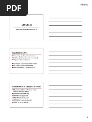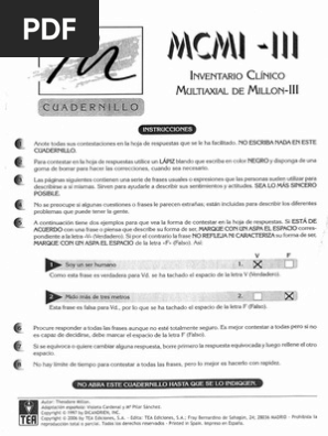 Mcmi iii manual pdf. Ted millon ted millon mcmi iii. Millon 2006 is a 175 i tem true false self report measure of 14 personality patterns and 10 clini cal syndromes for use with adults 18 years of age and older who are being evaluated and or treated in mental health settings. Evaluacion de 14 casos clinicos. It discusses the design development and operating characteristics of the.